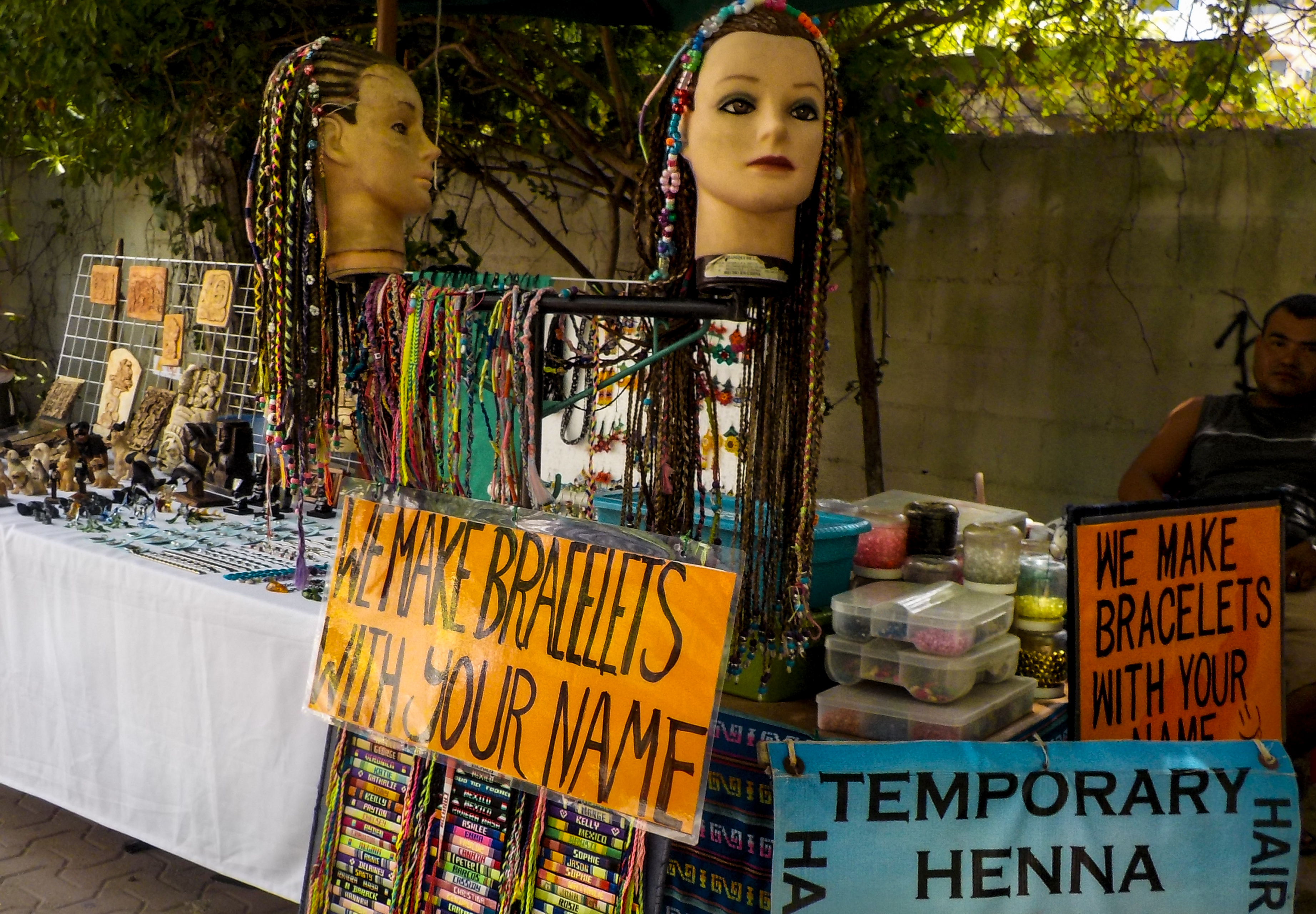One time, my sister and I were walking along the street, and we saw a fake head with braided beaded hair. We walked over because Mikayla wanted to have her hair braided and asked how much it would cost. We were told $15 USD. We only had $5 and 50 Pesos, about $9 USD total, so the woman lowered the price to what we were willing to pay, and Mikayla was able to get the style she wanted.