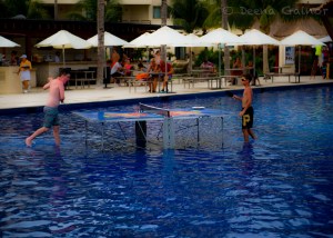 Pools: There are three great pools at this resort, and each one is different. One is an infinity pool that overlooks the beach and sea. You can watch the waves or a feisty game of volleyball while floating or swimming. This pool also has submersed “sunbathing beds” on which you can relax. The second is a very shallow pool area where little ones can wade or swim. At times, they also place ping pong tables right into the water (see above). The third pool is a regular pool. All three have plenty of seating. When we visited this resort, they were at 100% capacity, so the fact that we were able to find seats around the pool and at the beach was pretty impressive. At 100% capacity, however, there were definitely a lot of people in the pools.