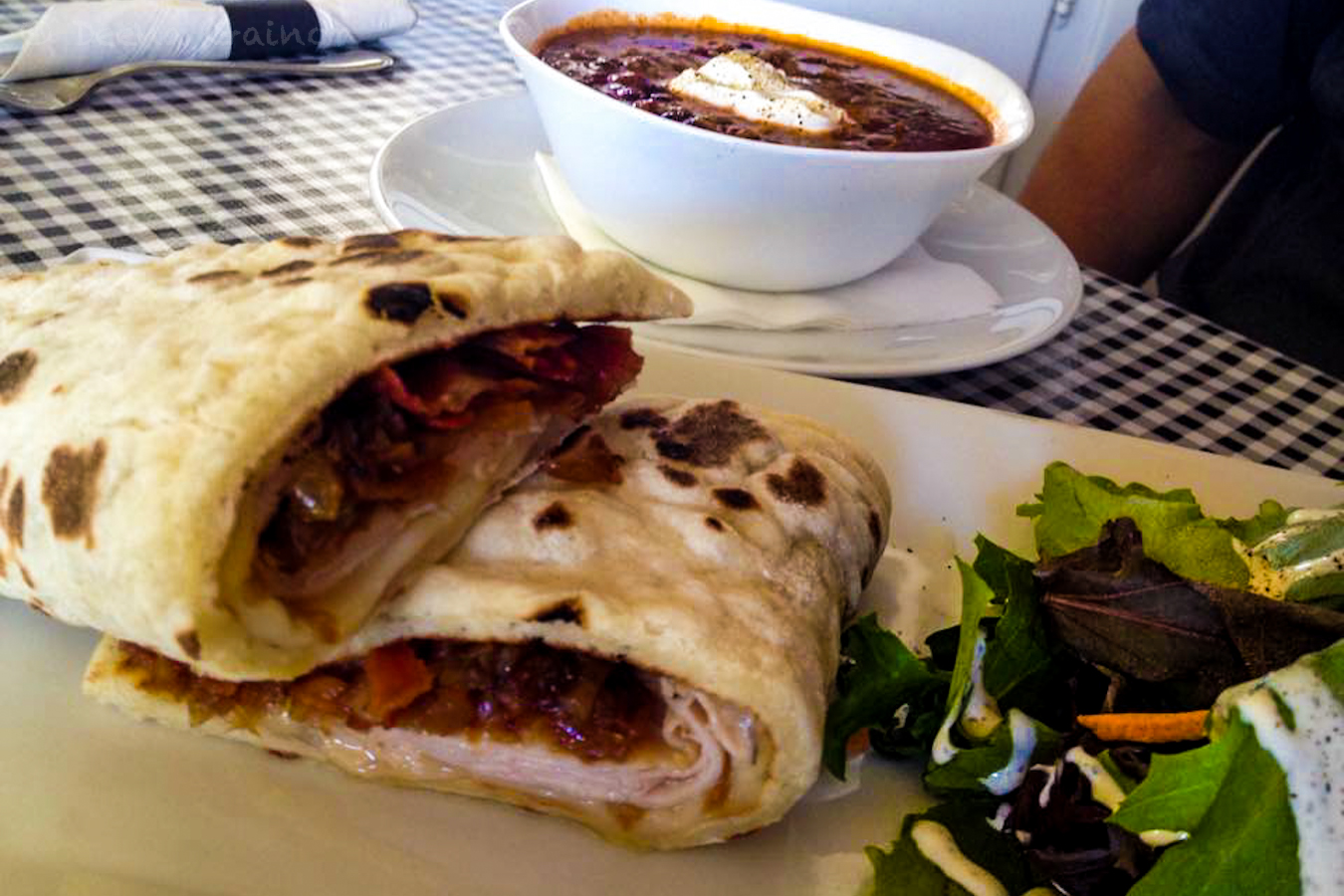 Ryan, the boys, and I got to enjoy the results of their training! The food was delicious. Below is the Turkey Chile and the Turkey, Havarti, and Bacon Piadina Sandwich we had for lunch, as well as some of the salads they made. It was absolutely delicious. The bread was fresh and is made daily! It reminded us of Indian Naan bread. Coupled with all of the ingredients used, it was an extremely delicious meal. (So delicious, that Ryan and I found ourselves at the Cafe again on date night!)