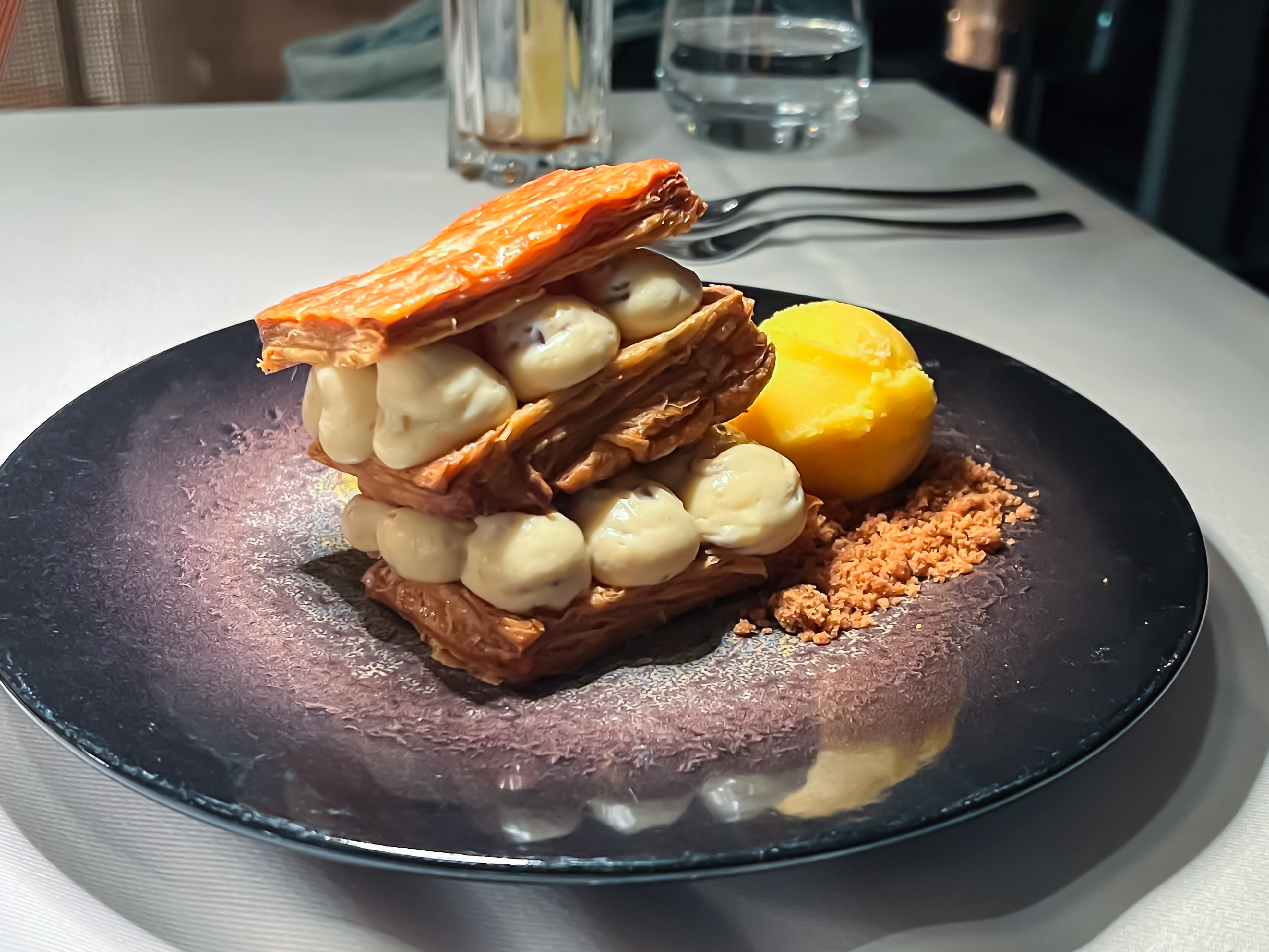 Carmelized Vanilla Millefeuille, Forest Berries, and Raspberry Sorbet.