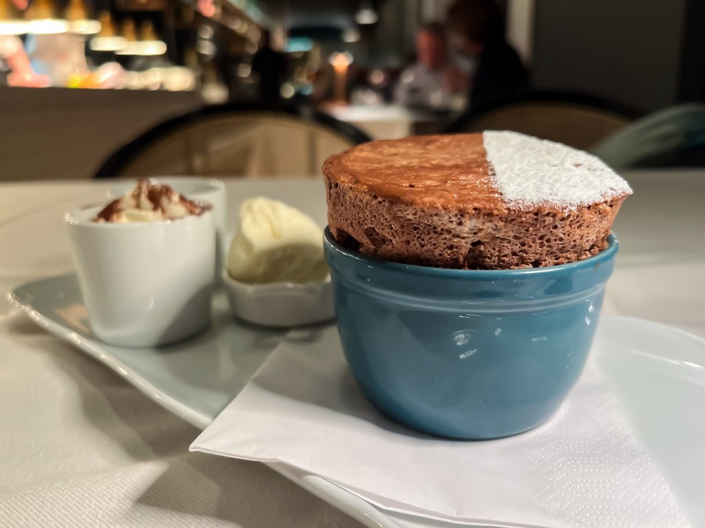 Dark Chocolate Soufflé served with Vanilla Ice Cream, Chocolate Sauce, and a creamy Whipped Crème Fraiche. This soufflé was the highlight of the whole evening.