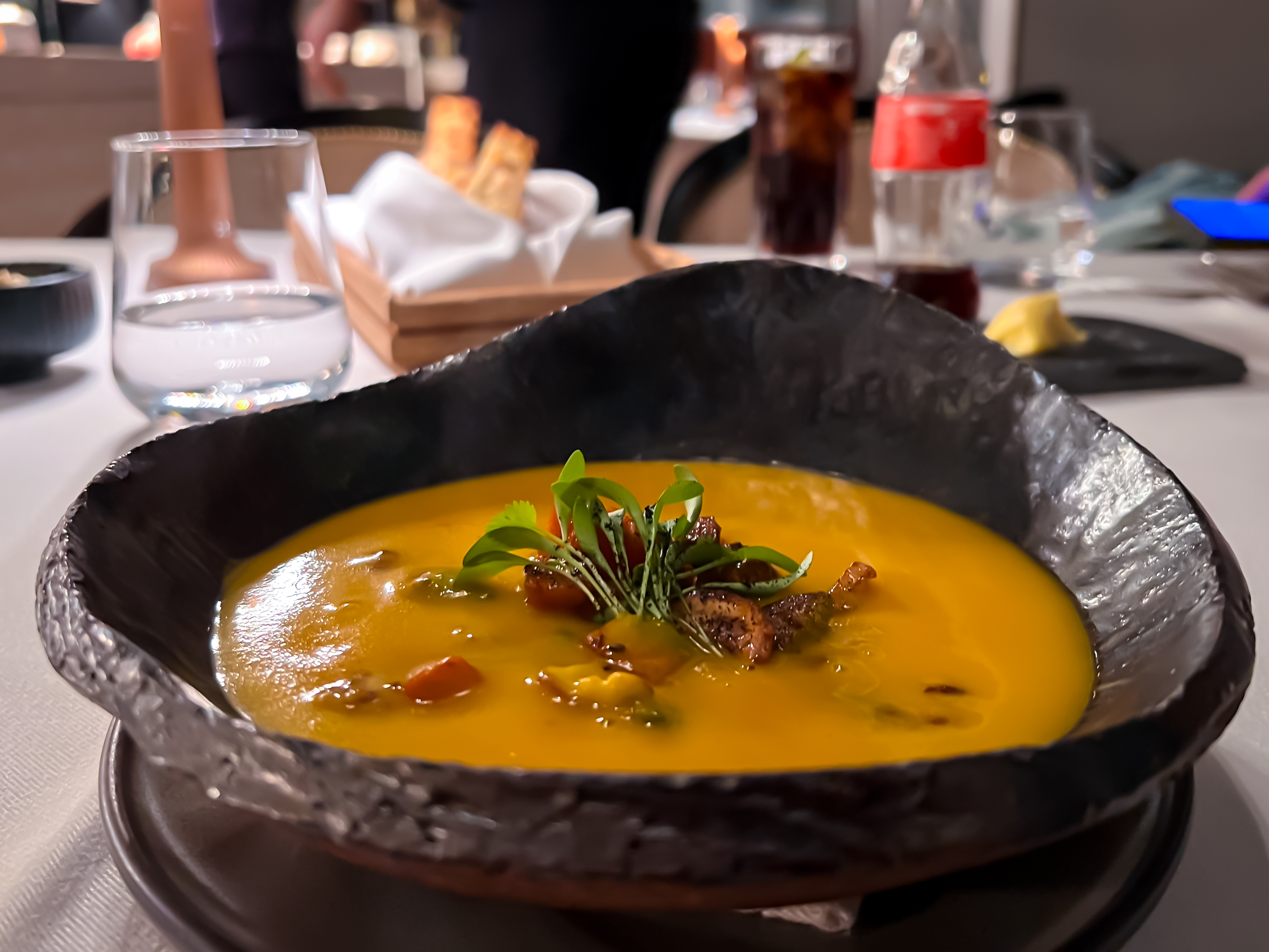 And finally…time to eat! First, a delicious sweet potato soup. See the video below to enjoy the way they presented this dish.