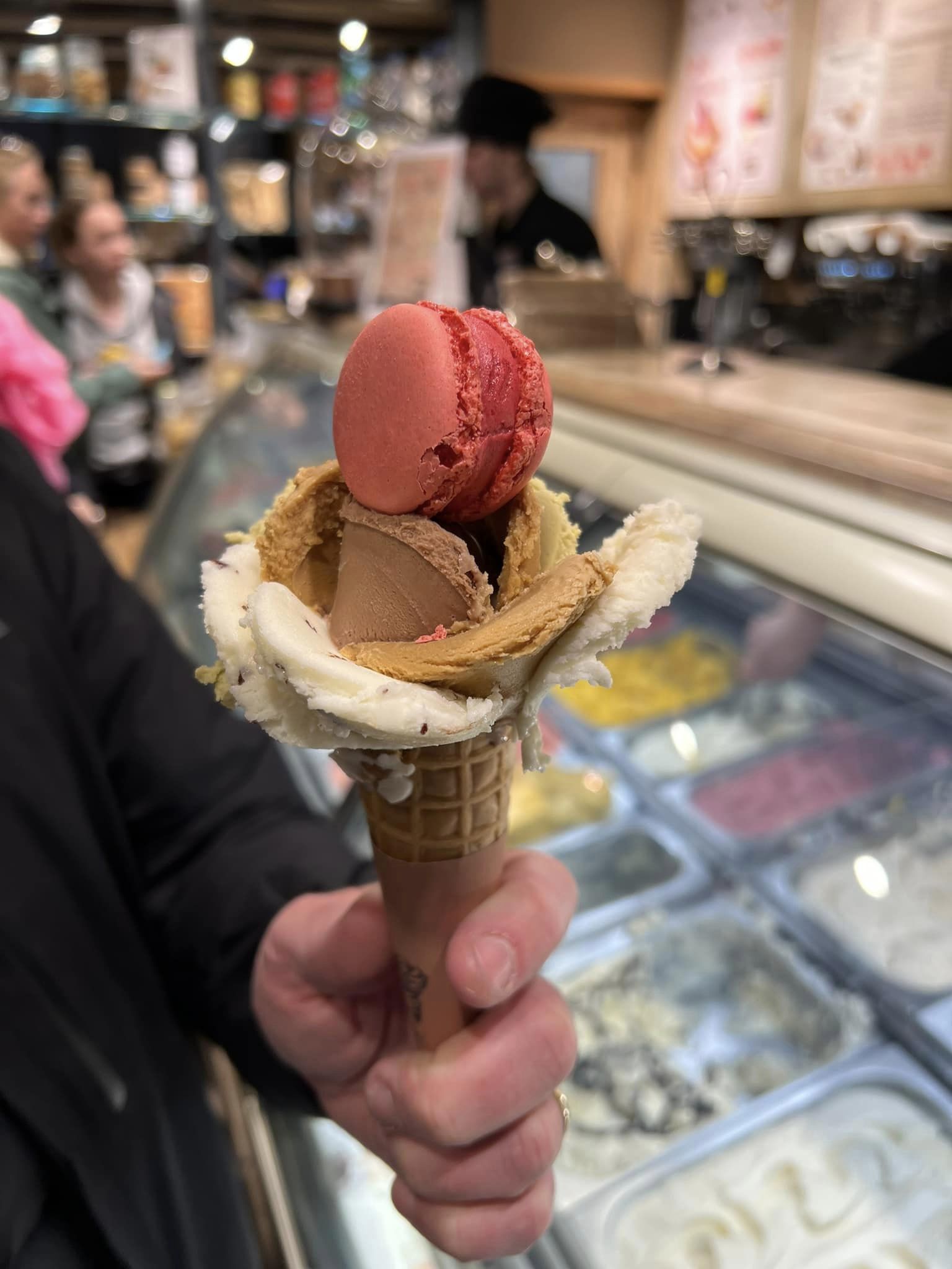 Next, make sure to note what is topping my “flower-shaped” gelato below. Yes, you’re right. It’s a French Macaron. Oh, and all those ‘petals’? They’re different flavors of gelato. As many flavors as you want…literally!